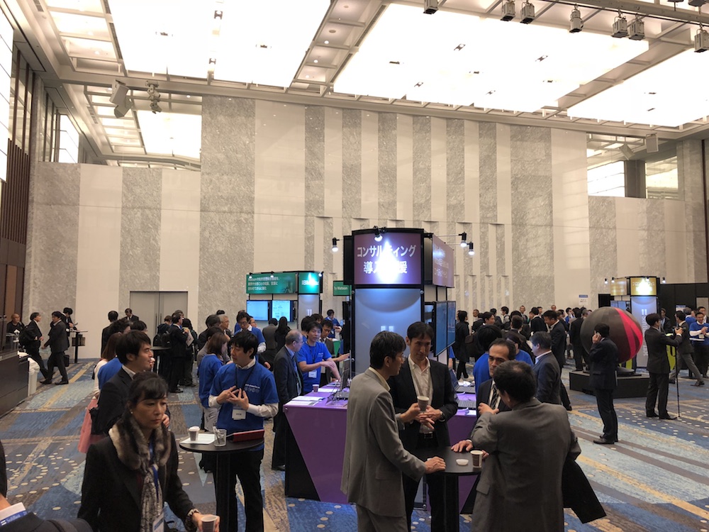 率直なところ、やはり人工知能は様々な業界から注目されているのだなと再認識をしました。当日の展覧ブースではIBMワトソンの導入事例や商談スペースなども設けられており、講演の合間に大勢の人が説明を受けていました。(下記の写真ですが、講演が行われている時間のため人が少ないですが、講演時間外には大勢の方で溢れていました)