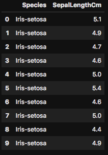 最後に「Species」と「SepalLengthCm」のみをフィルターしてみましょう。最初の10行のみを下記のコードでは表示させてます。