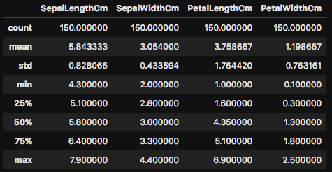 # CSVファイルをPandasのデータフレーム形式で読み込み Iris = pd.read_csv('Iris.csv') |