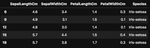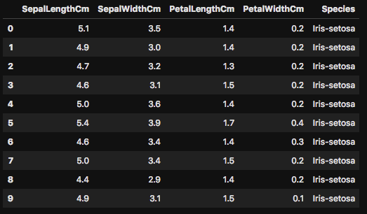次はアヤメの種類が「Iris-setosa」で最初の10行のデータを表示させてみましょう。
