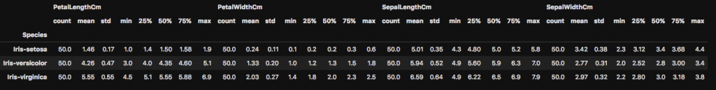 # アヤメの種類毎の特徴量のデータ分散を確認してみる Irisdes= Iris.groupby(['Species']) round(Irisdes.describe(),2) |