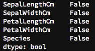 # データフレームの欠損を確認 Iris.isnull().any() |