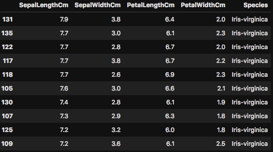 # 並び替え Iris.sort_values('SepalLengthCm', axis=0, ascending=False)[0:10] |