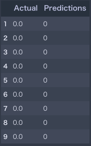 # X_testを使って予測を行う predictions = model.predict_classes(X_test) x = list(predictions) y = list(y_test_backup) results = pd.DataFrame({'Actual': y, 'Predictions': x}) results[1:10] |