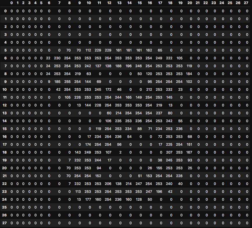 # Xの53238番目のデータをtest_numberへ切り出す test_number = X[53238] # reshape関数を使って784を28x28へ変換する test_number_image = test_number.reshape(28,28) # pandasのカラム表示の設定を変更 pd.options.display.max_columns = 28 # Numpy配列からPandasのデータフレームへ変換 number_matrix = pd.DataFrame(test_number_image) # number_matrixの表示 number_matrix |