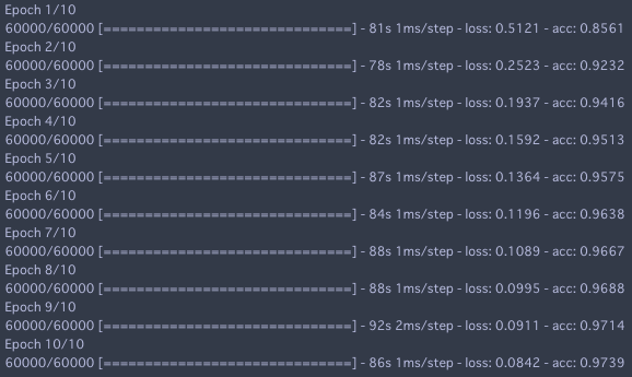 各エポックで「acc(精度)」が上がっているのが確認できます!最初の計算では0.8561でしたが、最後の10回目では0.9739と改善しています。