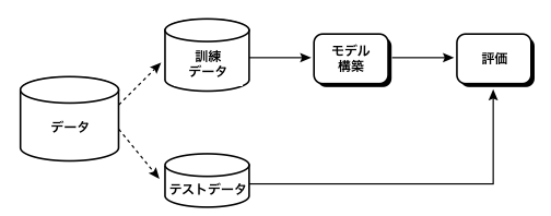 機械学習では、全てのデータセットを100%とした時に、訓練データを80%、テストデータを20%で分割して利用することが一般的です。(時に7対3など割合は変動します)
