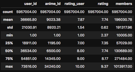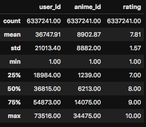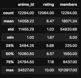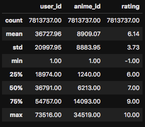データセットの説明文を読んでみると、この「-1」ですが、「アニメを観たことがあるが、レーティング(評価)を付与しなかった」という意味とのことです。このように、データには様々な癖のようなものがあり、それらを最初の段階で把握するのは機械学習において非常に重要な作業です。