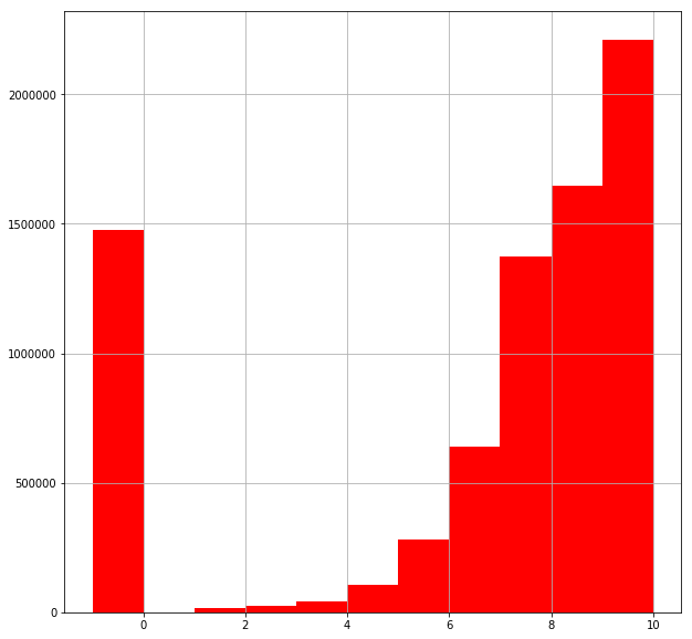 # ratingsのヒストグラムを作成 ratings['rating'].hist(bins=11, figsize=(10,10), color = 'red') |