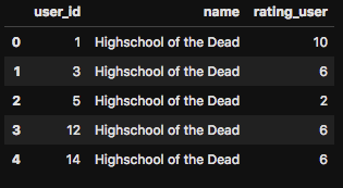 # 不必要な項目と重複項目を削除 mergeddf = mergeddf[['user_id','name','rating_user']] mergeddf = mergeddf.drop_duplicates(['user_id','name']) # head()で最初の5行を表示 mergeddf.head() |