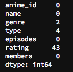 # 欠損データをdropna()でデータセットから取り除く anime = anime.dropna() |