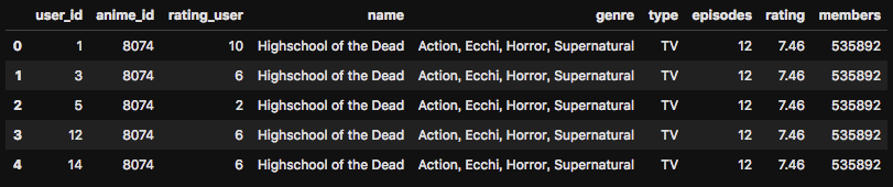 # animeとratingsの2つのデータフレームをマージさせる mergeddf = ratings.merge(anime, left_on = 'anime_id', right_on = 'anime_id', suffixes= ['_user', '']) # 合体したデータフレームの最初の5行を表示 mergeddf.head() |