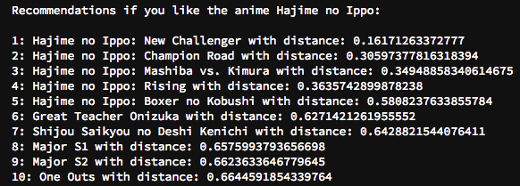 # 「はじめの一歩」に対してのオススメのアニメ10個 Anime = 'Hajime no Ippo' distance, indice = model_knn.kneighbors(anime_pivot.iloc[anime_pivot.index== Anime].values.reshape(1,-1),n_neighbors=11) for i in range(0, len(distance.flatten())): if i == 0: print('Recommendations if you like the anime {0}:\n'.format(anime_pivot[anime_pivot.index== Anime].index[0])) else: print('{0}: {1} with distance: {2}'.format(i,anime_pivot.index[indice.flatten()[i]],distance.flatten()[i])) |