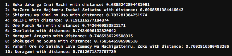 では、いよいよ構築したレコメンド機能の実力を試してみましょう!アニメタイトルを入力すると、モデルは10個のオススメのアニメタイトルを返してくれるはずです。