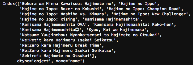 # データセットのタイトルをキーワードで検索 def searchanime(string): print(anime_pivot[anime_pivot.index.str.contains(string)].index[0:]) searchanime('Hajime') |