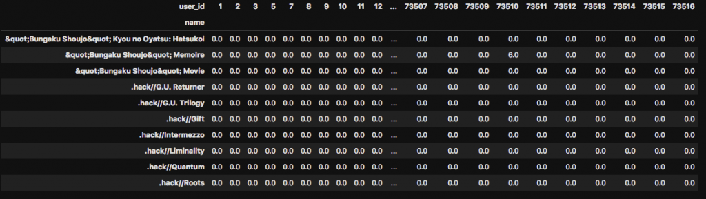 先ほど説明した通り、データフレームのindex(上記表でいう一番左の部分)がアニメのタイトルになっており、各列がユーザーのIDを表しているのが分かります。