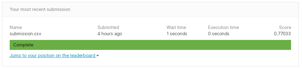 正解率は0.77でした。他にも、交差検証の種類やモデルを変えて、サブミットのスコアが変化するか試してみてください。これでコンペティションで使用する交差検証の実装は完了になります。