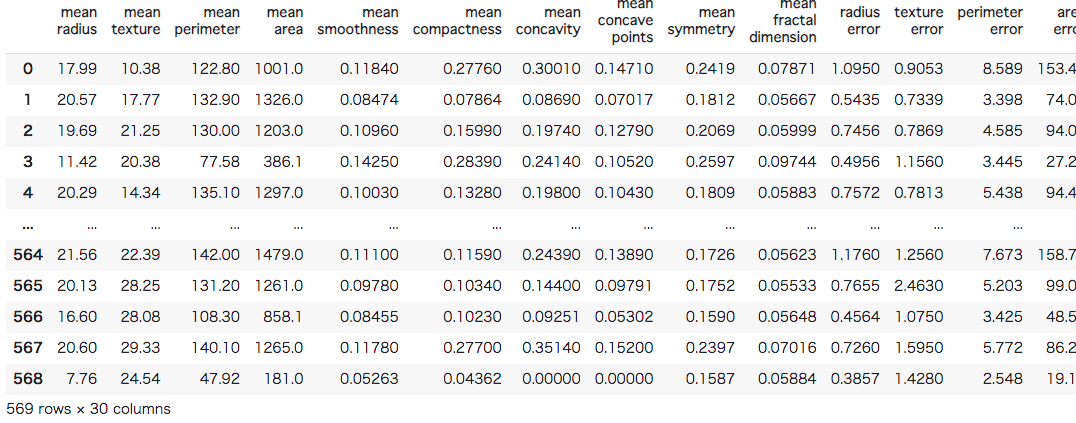 次に、データセットを準備します。今回使用するデータセットは乳がんのデータセットです。30の特徴量から悪性と良性の2値分類を行います。データ数は全部で569です。本稿では各特徴量に関する解説は省きますが、興味のある方はダウンロード元を調べてみてください。(参考:Breast Cancer Wisconsin (Diagnostic) Data Set)