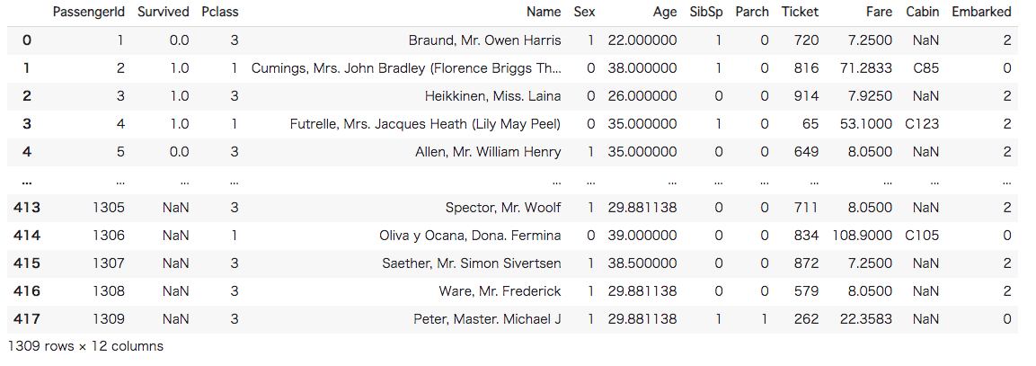 #[IN] #欠損値の補完 all["Age"] = all["Age"].fillna(all["Age"].mean()) all["Fare"] = all["Fare"].fillna(all["Fare"].mean()) all["Embarked"] = all["Embarked"].fillna("S") #文字列を数値に変換 colum=["Sex","Ticket","Embarked"] for c in colum: le = LabelEncoder() le.fit(all[c]) all[c] = le.fit_transform(all[c]) all |