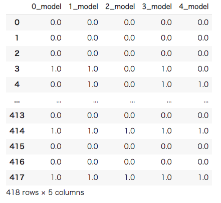 #[IN]: #結果を辞書に保存 solution = {} #各モデルで予測 for i, model in enumerate(model_list): test_pred = model.predict(test_data) solution[str(i)+"_model"] = test_pred #辞書からDataFrameに変更 solution=pd.DataFrame(solution) solution |