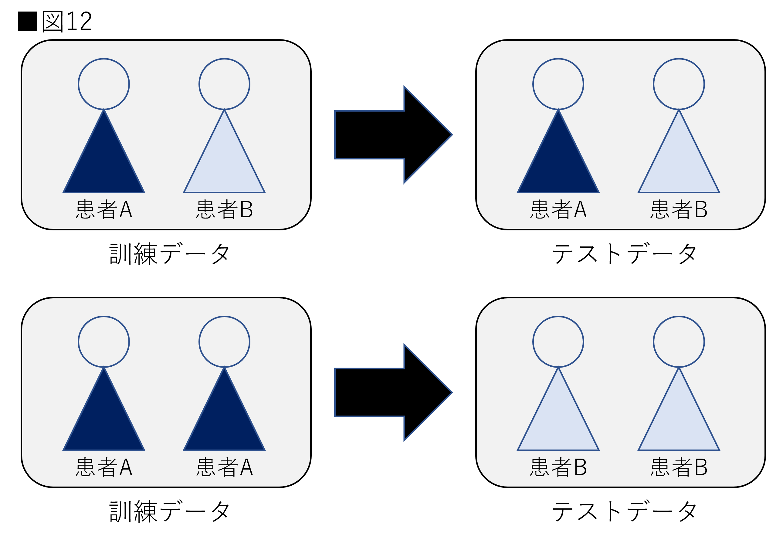 グループK分割交差検証(以下:Group K-Fold)は訓練・テストデータの両方に同一のグループが含まれることを避ける交差検証です。例えば医療画像などで、同一の患者が訓練・テストデータの間で被らないようにする場合などで使用されます。仮に、同じ患者のデータは他の患者に比べて似る傾向があるとします。訓練データで学習した患者と同一患者をテストデータで予測する場合、他の患者を予測するよりも簡単である可能性があります。図12は医療データの分割の例を示しています。