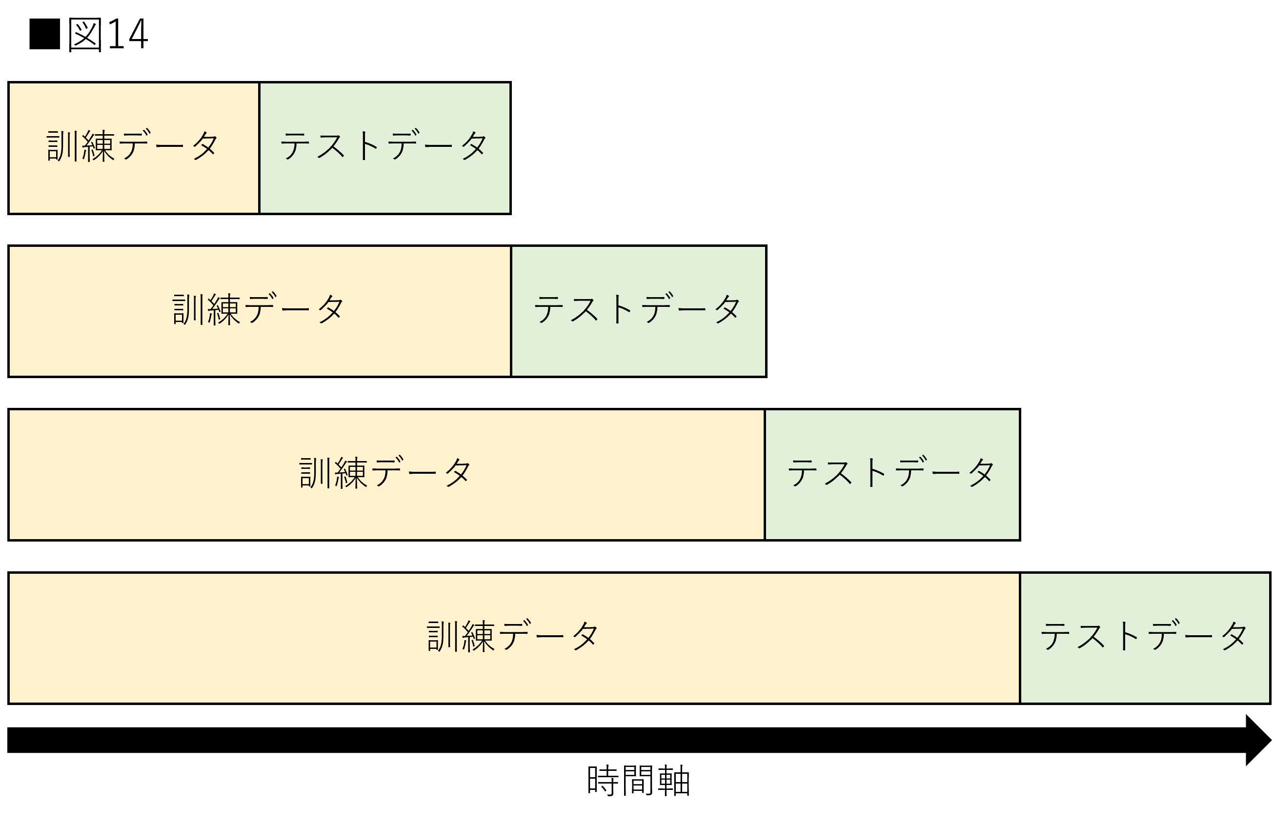 時系列交差検証は時系列に沿った交差検証を行うための方法です。時系列データには1つのデータに対する過去と未来が存在します。仮に、未来のデータを用いて訓練を行なった場合、他の未来データに対する予測も容易になる可能性があります。そのため、時系列に沿った分割を行う必要性があります。時系列交差検証はこれらの問題を解決します。図14は時系列交差検証を示しています。