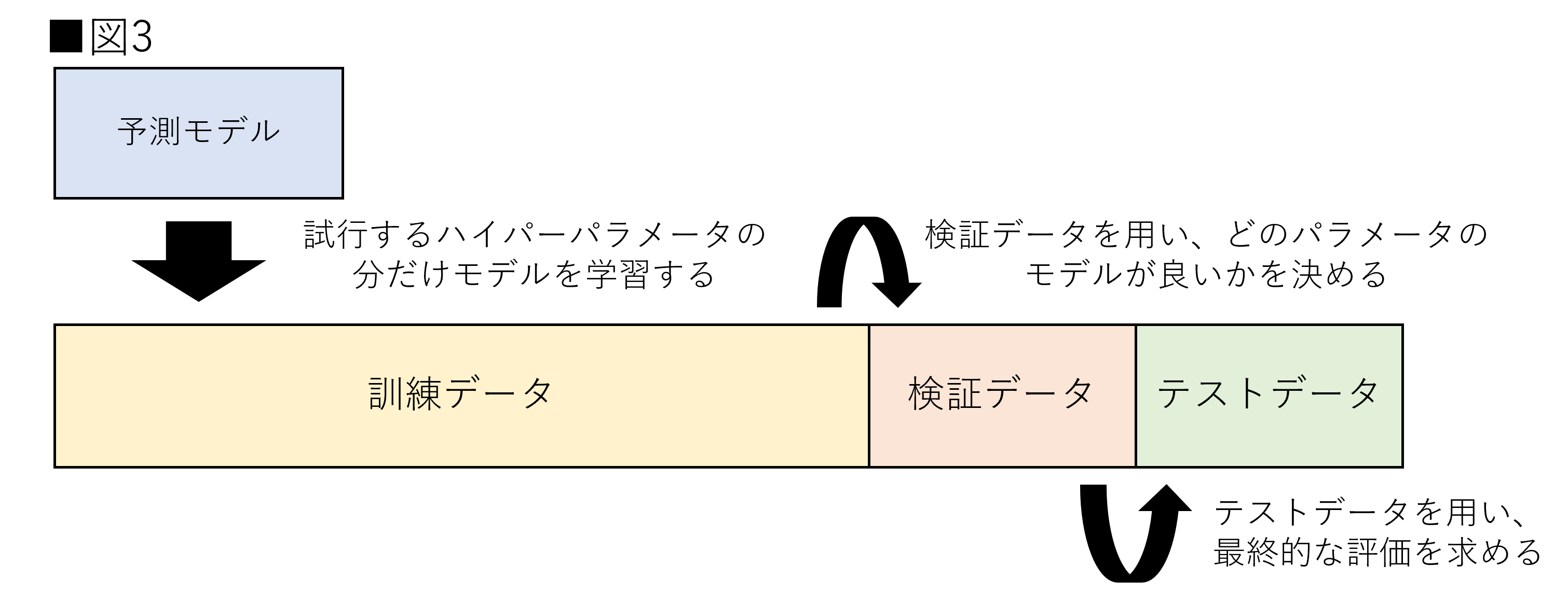 図2ではデータセットが3分割されています。まず、訓練データで各パラメータに対するモデルの学習を行います。次に、検証データで各パラメータで学習したモデルの評価を行い、最も適切なパラメータを持つモデルを選択します。最後に、選択されたモデルを用いて、テストデータに対する評価を行います。図3にはハイパーパラメータの調整の流れが示されています。