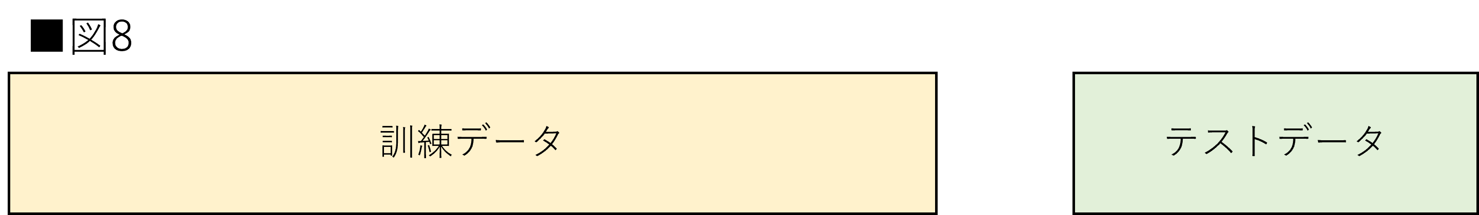 機械学習は与えられたデータセットからモデルを作成します。次に、モデルが未知のデータに対してどの程度の精度を持つかを評価します。そのため、与えられたデータセットを訓練データとテストデータに分割する必要があります。図1はデータ分割を示しています。