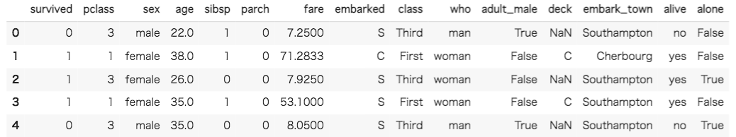 #[IN]: #titanicデータセットを読み込んで、一部を表示 df = sns.load_dataset('titanic') df.head() |