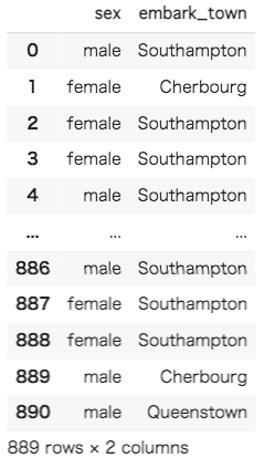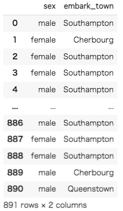 データセットの最初5行が表示されました。今回はOne-Hotエンコーディングの実装が目的なため、データセットの中から名義尺度であるものを抜き出します。変換後の結果が分かりやすいようにsex(性別)とembark_town(出航地名)を使用してみましょう。