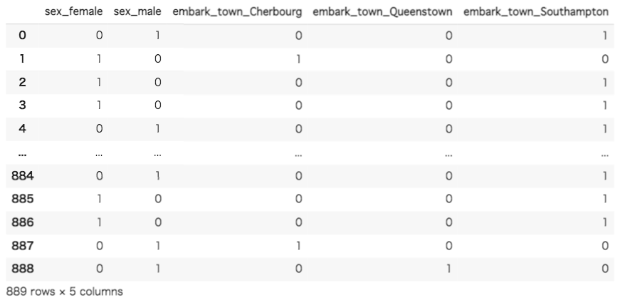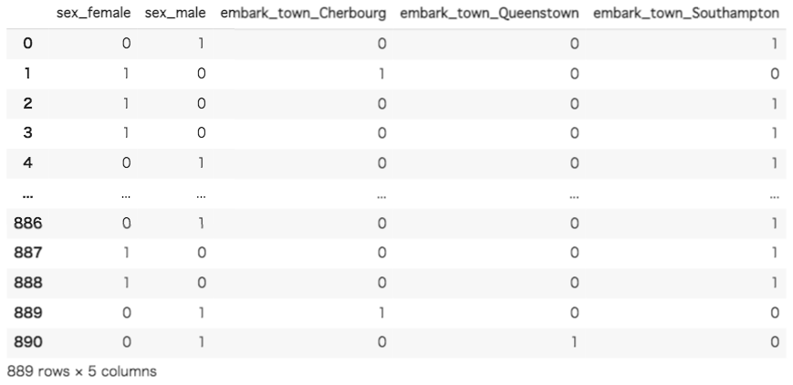 ダミー変数によってOne-Hotエンコーディングが行われたことが確認できました。前半で説明したように、「sex」の列が「sex_female」と「sex_male」に、「embark_town」の列が「embark_town_Cherbourg」と「embark_town_Queenstown」、「embark_town_Southampton」として新しい列に変換されています。確認すると、変換前の列に存在した変数が新しい列では1と0で表現されています。
