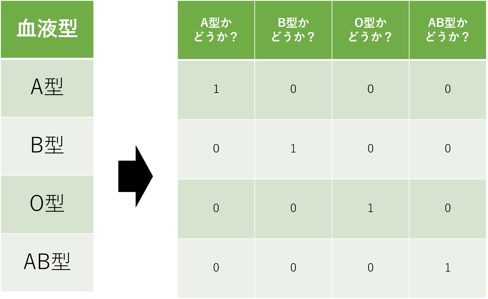 名義尺度をダミー変数で変換した場合を見てみましょう。「血液型」の列には「A型」「B型」「O型」「AB型」を表した変数が存在しています。それをダミー変数を用いて変換すると4列の表になります。この時の2つの表の違いに着目してみましょう。