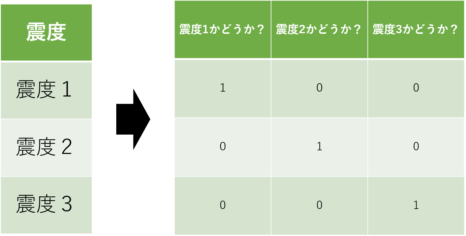 震度の列には大小関係が存在しています。揺れは「震度2」が「震度1」よりも大きく、「震度3」は「震度2」よりも大きいことは既知です。変換前の表は震度の変数が順番に並んでいるため、大小関係を認識することができます。対して、変換後の表はそれぞれの震度を3列に分けて表現されています。つまり、それぞれの震度が独立して存在していることになります。このような変換を行なってしまうと、震度自体を数値に変換することはできていますが、震度に対する大小関係が認識できなくなってしまっています。