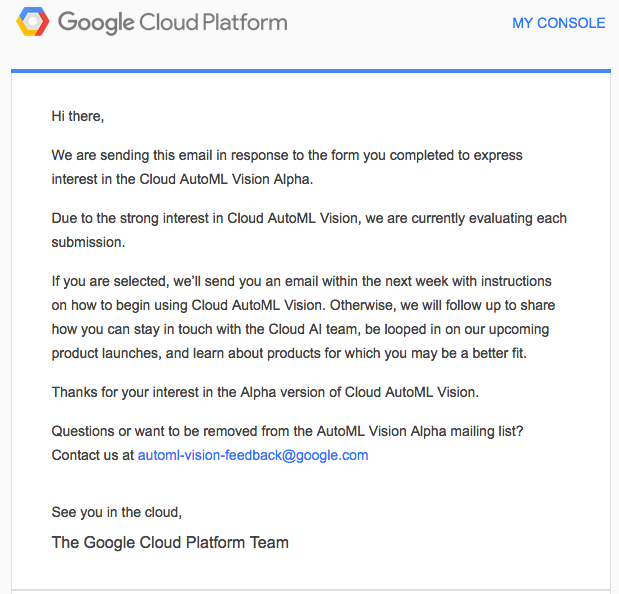 要約すると、「AutoML Visionのα版を公開しましたが、想定以上にリクエストが多かったので、現在、選定作業を行ってます。もし選定結果が合格の場合は、2月4週目から順次使えるようになります」とのことでした。