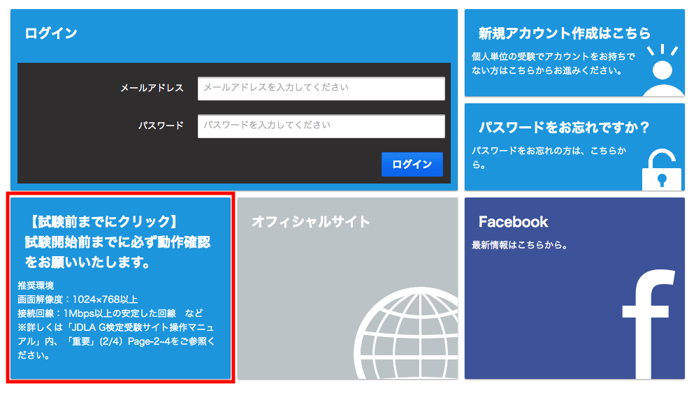 G検定は、非常に珍しいオンライン受験で、自宅で受験することとなります。専用の受験サイトでログインして試験ページに入るのですが、PCが受験に対応しておらず、受験できない場合があります。そのような事態を防ぐために、受験サイト左下の欄(下図3参照)から動作確認を行うことをJDLAから推奨されますので、必ず行っておきましょう。