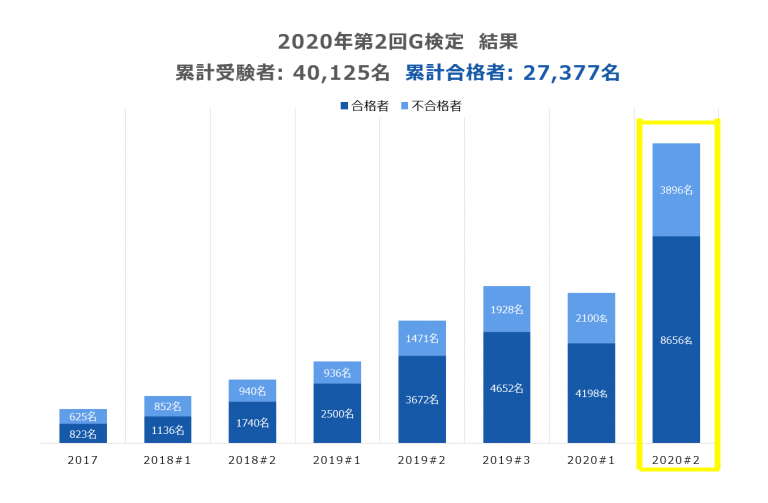 2020年7月4日(土)に実施されたG検定の受験データが発表されました。 今回のG検定は、12,552名の方が受験され、8,656名の方が合格されたようです(合格率は68.96%)。合格された皆様、おめでとうございます!