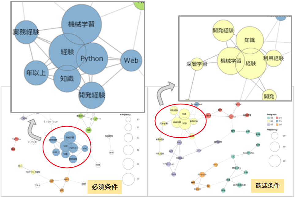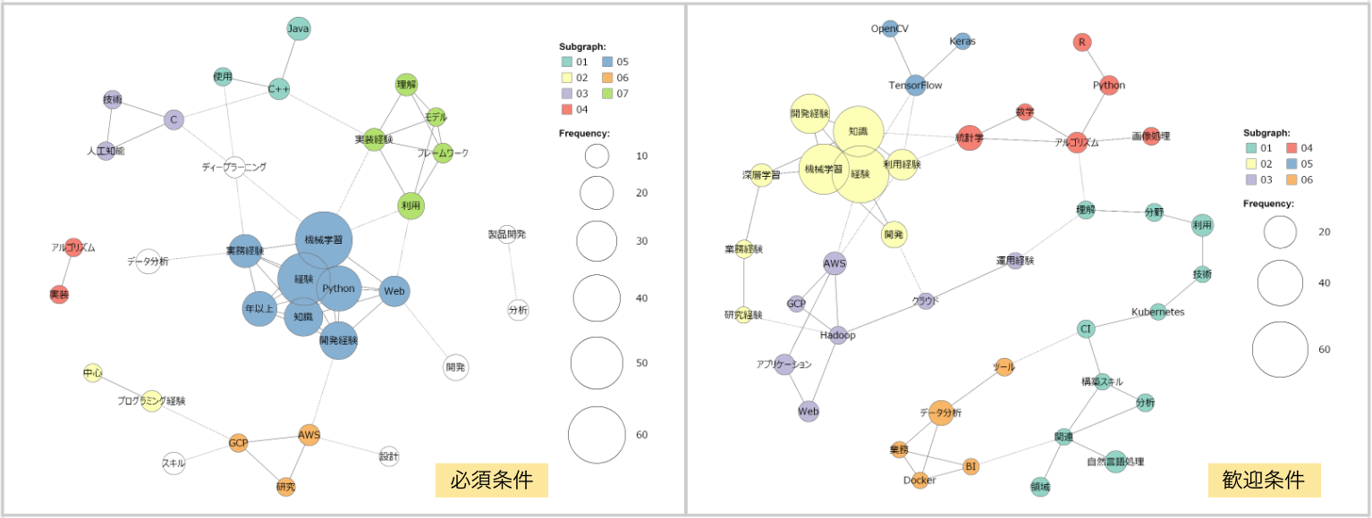 上の図は、約100件の機械学習エンジニアの求人情報に記載されていた、応募の「必須条件」と「歓迎条件」の頻出語をそれぞれグルーピングして可視化したものです。これらの図を活用して、機械学習エンジニアの「必須スキル」と機械学習エンジニアになった際に重宝される可能性がある「+αスキル」について解説します。(画像が小さくて見づらい方は、以下のリンクをご利用ください。「必須条件.png」「歓迎条件.png」「必須条件と歓迎条件.png」)