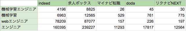 上の表を見ると、「機械学習エンジニア」ではあまりヒットしないサイトもあることから、まだそれほど一般的な名称とは言えないようです。ただ、「webエンジニア」や「エンジニア」には及ばないものの、「機械学習」関連の求人は一定数あることがわかります。
