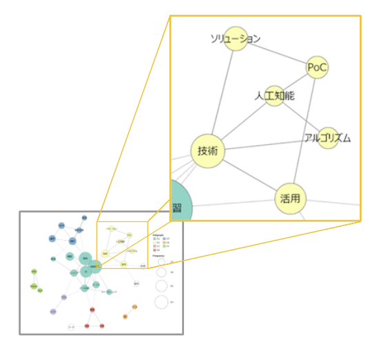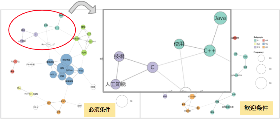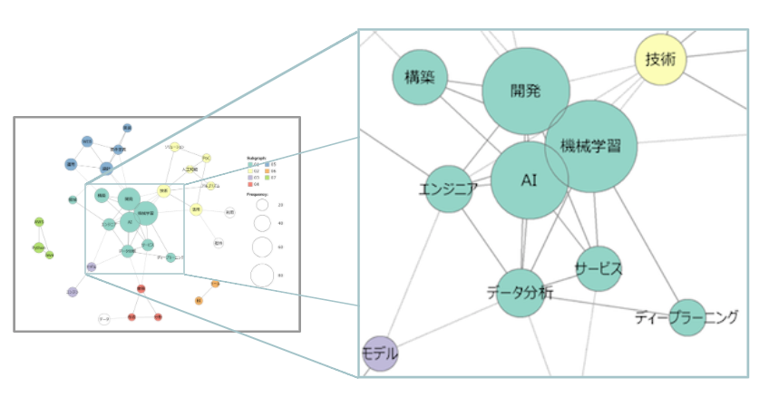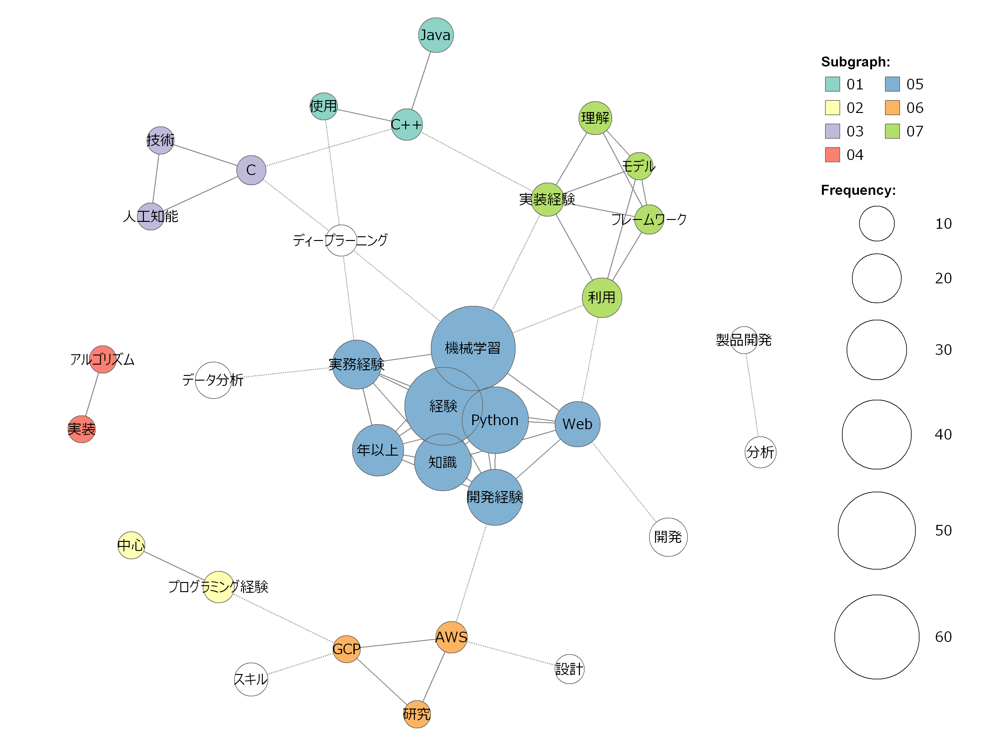 この図は、共起ネットワークと呼ばれる可視化手法で、仕事内容のテキストから抽出した頻出語をグルーピングして可視化したものです。円が大きいほどその単語の出現頻度が高かったことを表し、単語同士の関係性の強さは線の有無や、実線と点線の違いで表現されています。この図を読み解くことで、現在の機械学習エンジニアの求人における「仕事内容」の傾向をつかむことができます。