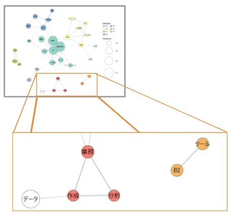 オレンジと赤のグループからは、BIツールを用いたデータ分析を行うことがわかります。BIとはビジネスインテリジェンスの略で、企業内の様々なデータを蓄積・分析することで、企業の意思決定に役立てることを指します。BIツールとは、そのための可視化ツールなどの事です。機械学習エンジニアはデータの扱いや読み取りに長けていると考えられることから、こういった業務も任されるのでしょう。
