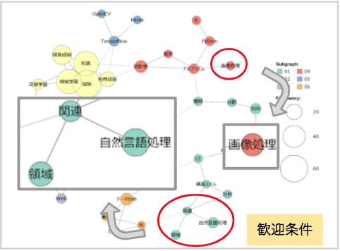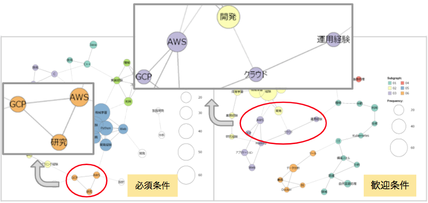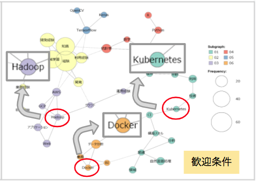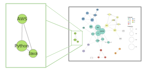 最後に、黄緑色のグループを見てみましょう。Python、Java、AWSとあることから、開発はPythonやJavasなどの汎用プログラミング言語で行い、インフラにはAWSなどのクラウドサービスを活用していることが伺えます。