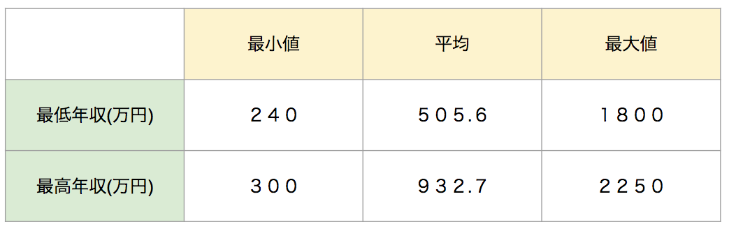 次に、機械学習エンジニアの年収について解説します。今回分析したデータは、年収が求人によっては月給で表記されており、たいていが最低と最高のレンジで表記されていました。年収と月給を直接比較できるようにするために、月給の場合は15倍(12ヵ月分プラス賞与)にしました。年収と月給どちらも載っている場合は、年収と月給×15の大きいほうを採用しています。この作業を最低年収と最高年収それぞれで行い年収のレンジを計算しました。その結果以下の表のようになりました。