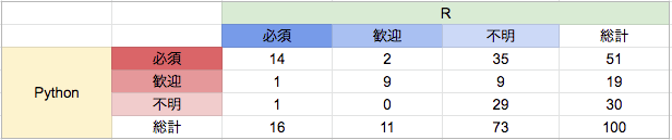 上の表は、今回分析に用いた求人データをPythonとRに関して集計したものです。必須としている求人件数、歓迎としている求人件数、必須または歓迎としている求人件数のすべてでPythonに軍配が上がりました。特に、必須としている求人件数は35件の大差がついています。また、Pythonを必須または歓迎としていて、Rに関しては不明の求人は44件あるのに対し、Rを必須または歓迎としていて、Pythonに関しては不明の求人はわずか1件しかありませんでした。このことから、日本の企業ではPythonの方が人気があり。Rは+αのスキルと捉えられていると思われます。これから機械学習を学び始める方は、Pythonを学ぶのが無難でしょう。