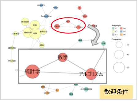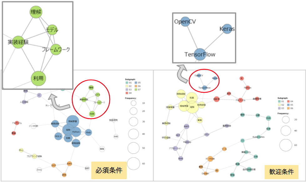 次に、黄色で表現されているグループから、人工知能・アルゴリズムのPoC(Proof of Concept, 概念実証)も仕事内容であることがわかります。PoCとは、新たな概念やアイデアが実現可能なものであるかどうかを検証する作業のことです。機械学習エンジニアには、既存の手法を活用するだけでなく、新たなアイデアを検証する能力も求める企業が多いようです。