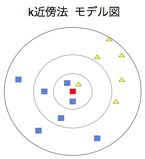 機械学習に入る前に、本稿で用いる手法「k近傍法」の概要を説明します。k近傍法は、単純に言うと「新しいサンプルと特徴が似ているいくつかのサンプルのラベルを参考にして、新しいサンプルのラベルを予測する分類手法」です。より具体的に言うならば、k近傍法では特徴量から各サンプルの空間上の位置を算出し、各サンプルを空間上にプロットします。そして、新しい点に対して各サンプルとの距離を計算し、距離が近い複数の(k個の)点のラベルから新しい点のラベルを予測します。下のモデル図でイメージを掴みましょう。