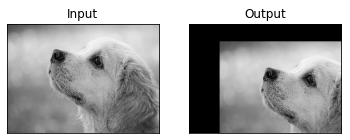 [In] : #画像の移動量を決定して変数に格納 M = np.float32([[1,0,50],[0,1,30]]) #画像を平行移動 moved = cv2.warpAffine(img,M,(250,180)) #関数を利用して画像を表示 show_img(img,moved) |