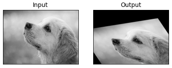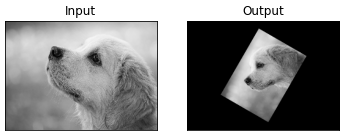 [In] : #画像の行数・列数を変数に格納 rows,cols = img.shape[:2] #画像の回転量を決定して変数に格納 M = cv2.getRotationMatrix2D((cols/2,rows/2),60,0.5) #画像を回転 rotated = cv2.warpAffine(img,M,(cols,rows)) #関数を利用して画像を表示 show_img(img,rotated) |