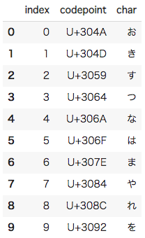 [Out] : 8 index codepoint char 0 0 U+304A お 1 1 U+304D き 2 2 U+3059 す 3 3 U+3064 つ 4 4 U+306A な 5 5 U+306F は 6 6 U+307E ま 7 7 U+3084 や 8 8 U+308C れ 9 9 U+3092 を |