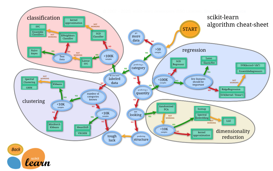 2つ目の特徴は、チートシートを参考にして簡単にアルゴリズムを選択できる点です。用意されているアルゴリズムがどれだけ豊富でも、どの手法を用いればいいのか分からなければ意味がありませんね。しかし、アルゴリズムのメカニズムは複雑であるため、どの手法を用いるのが適切なのかを知るためにあらゆる手法について詳しく学んでいては、いつまでたっても機械学習を実践することはできないでしょう。そんな悩みを解決してくれるのが下のアルゴリズムチートシートです。